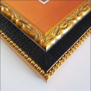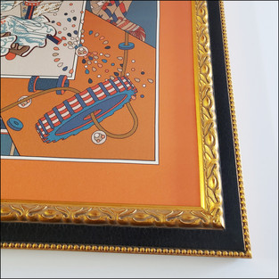 こちらはダブルフェイス(両面)プリントのもので、 アーティスト ピエール・マリーのデザインされた、2010年から最新作までの モチーフを大胆に使ったスカーフです。 直線が多いものなので、手表具で裏打ち加工をいたしました。 オレンジと青の色使いに負けないように、黒と金色のコンビの額で 豪華さを演出しました。